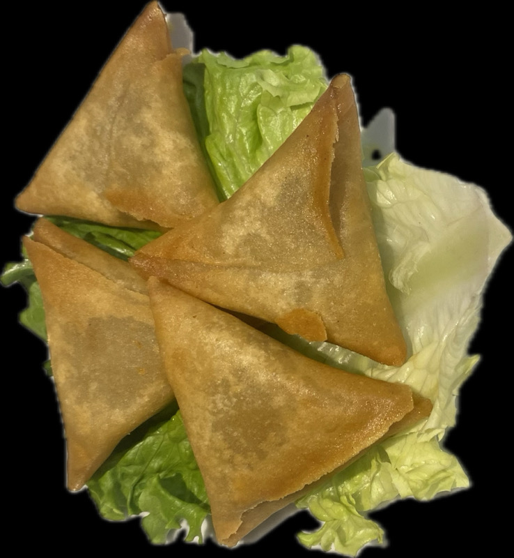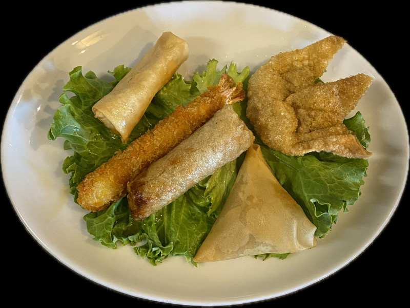 3 nems (porc, poulet, crevettes ), 2 samoussa au bœuf, 1 raviolis aux crevettes frit, 3 raviolis au poulet poêlés, accompagné de nouilles sautées aux légumes [3 spring rolls (pork, chicken, shrimps), 2 beef samoussas, 1 fried shrimp ravioli, 3 chicken pan-fried raviolis, with stir fried vegetables rice noodles on the side]
